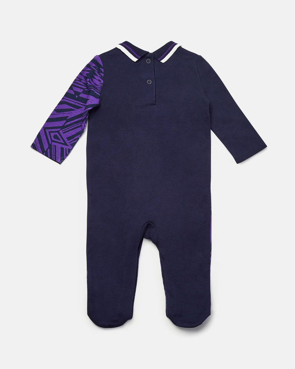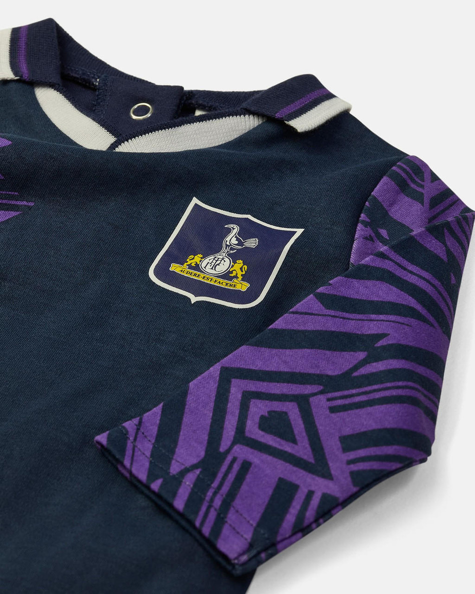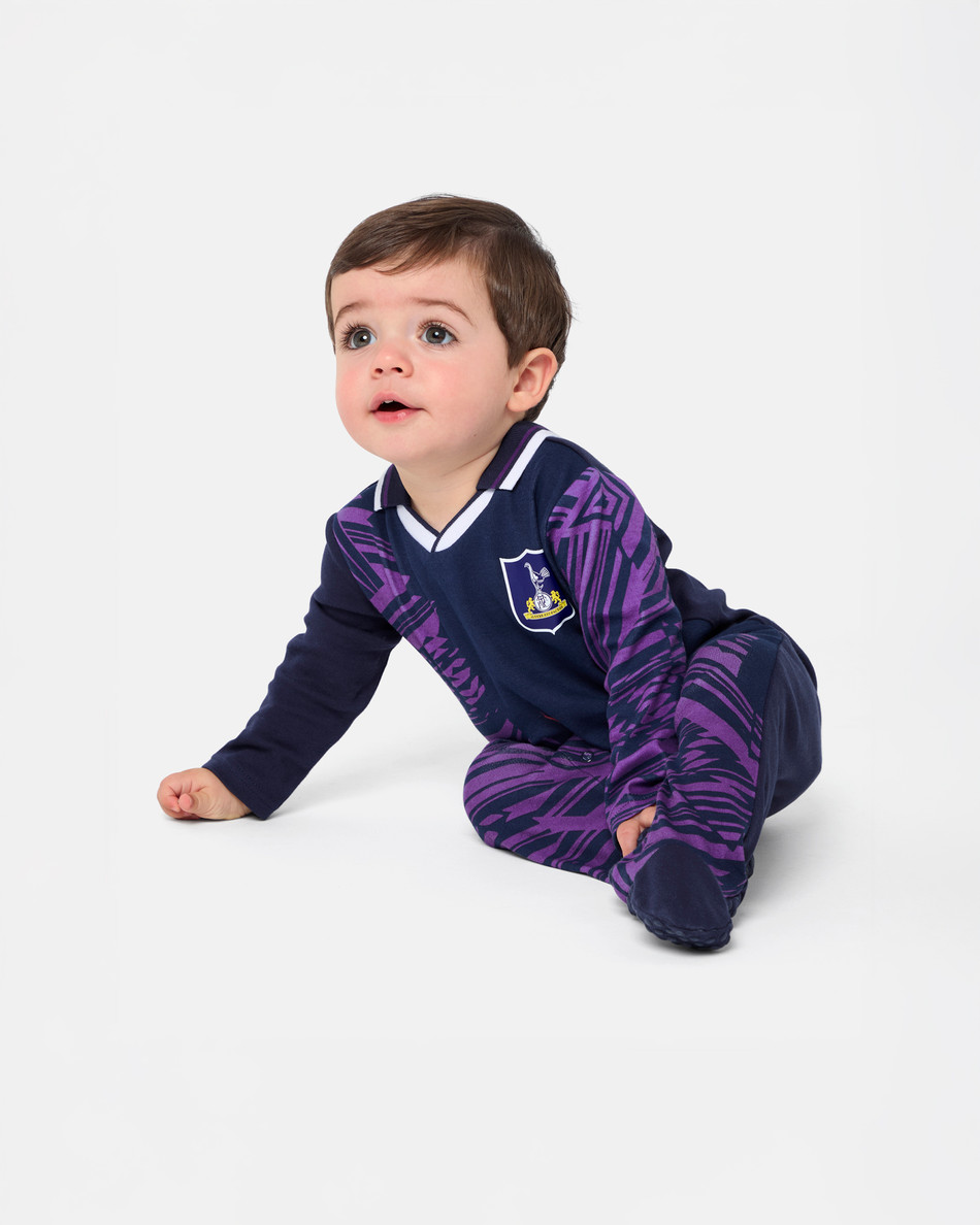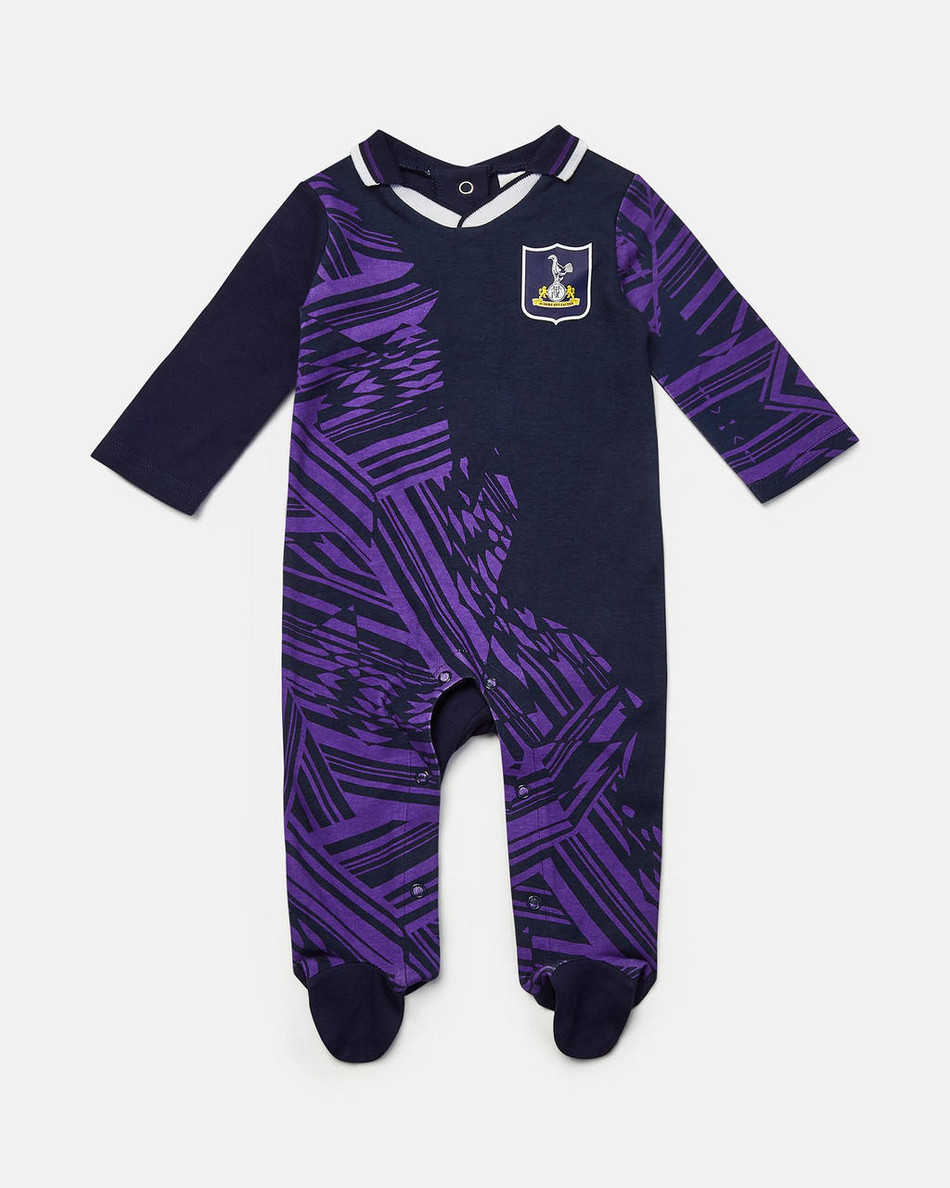 Ensure your little fan sleeps in style with the Spurs Retro Baby Crest Away Sleepsuit. Featuring a cool retro shield design and the eye-catching purple and navy away kit, this sleepsuit combines comfort and team spirit. Made from 100% cotton, it's exceptionally soft against your baby's skin. The stylish V-neck collar and convenient popper fastenings make it a practical choice for parents.