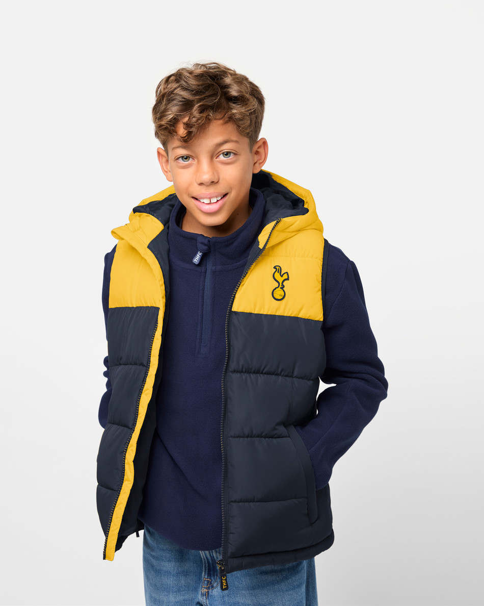 The Spurs Kids Colour Block Yellow Gilet is a versatile addition for young fans. With pockets on the side for convenience, it features an rubber cockerel and yellow and navy accents, blending practicality with team pride. Ideal for layering during cooler weather, this gilet allows kids to showcase their support for Spurs with comfort and style.