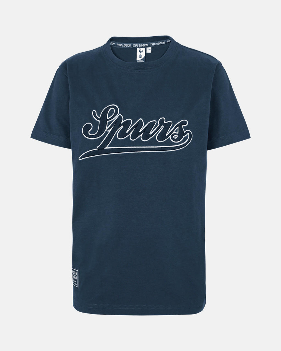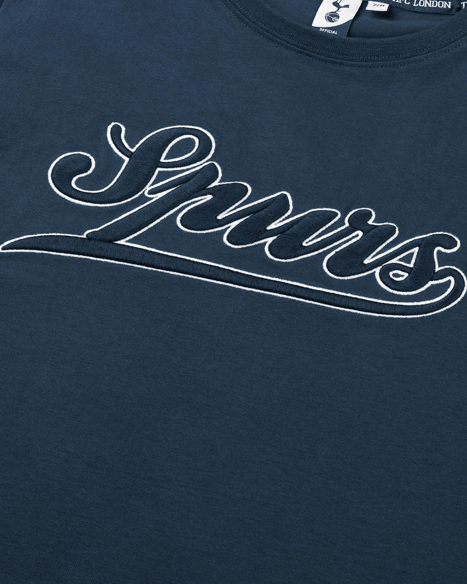 Gear up for match day with the Spurs Kids London Script Navy T-Shirt. Crafted from ultra-soft peached cotton, this tee ensures all-day comfort. Featuring embroidered navy "Spurs" text in varsity style, it is a must-have for young fans. The woven label on the bottom right adds a subtle touch with the cockerel, "London Tottenham Hotspur," and stadium coordinates. The neck tape enhances the design with "THFC London" in cream on navy.