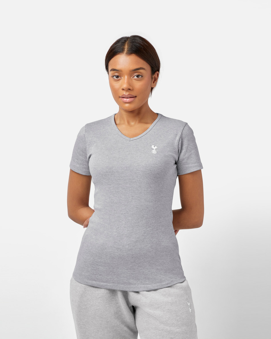 Model wears size UK 10 and is height 170cm/5'7".The Spurs Women's Essential Grey V-Neck T-Shirt is a perfect blend of comfort and style. Featuring a flattering V-neck design, this versatile grey T-Shirt showcases your Spurs pride with understated elegance. Ideal for any casual occasion, it's a must-have addition to any fan's wardrobe.