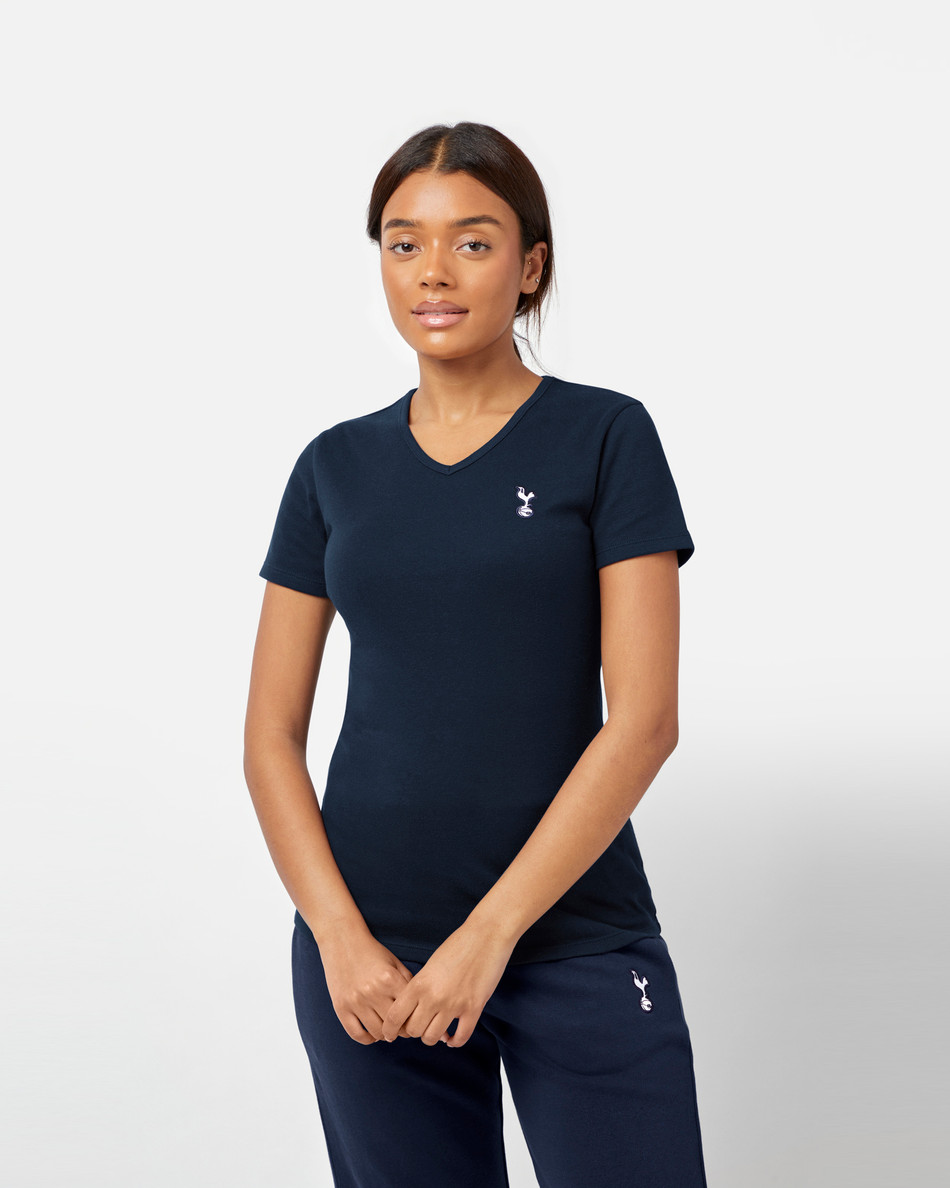 The Spurs Women's Essential Navy V-Neck T-Shirt is a perfect blend of comfort and style. Featuring a flattering V-neck design, this versatile navy T-Shirt showcases your Spurs pride with understated elegance. Ideal for any casual occasion, it's a must-have addition to any fan's wardrobe.